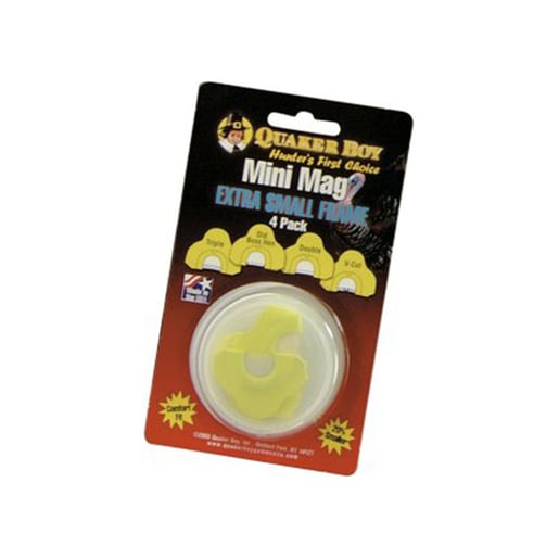 Quaker Boy Mini Mag Turkey Call 4 Pack - Designed for the narrow palate The Mini-Mag's new frame design will allow the call to seal on the narrowest palate with comfort and superior air sealing capabilities. 4 Pack features Double, Triple, Old Boss Hen and V' Cut mouthcalls. 3 Calls for the price of 2