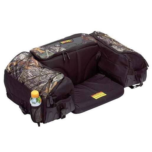 Kolpin Pursuit Camo ATV Matrix Seat Rack Bag - ATV Matrix Seat Rack Bag in Kolpin Pursuit Camo pattern fits most ATV racks using reinforced buckles. 3-piece zippered bag design including center cooler and UV coating. Padded backrest and seat pad for added comfort. Durable 600D Nylon construction with Hydro Shield and UV coating Exterior shock-cord for smaller items (2) water bottle holders that zip closed when not in use 57 liters of accessible storage Reinforced buckles allow for easy on/off of most ATV racks Padded backrest and seat pad for added comfort Overall Dimensions 32in x 22in x 11in and Side Pod Dimensions: 16in x 6in x 8in
