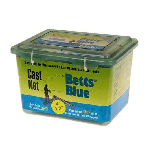 Betts Blue Live Bait/Shrimp Cast Net - The engineering, design and quality of this blue mono net with heavy mono, more and larger braille lines, bonded thread, treated leadline, strong selvege and excellent design that opens fully and sinks faster, makes this the standard by which all blue nets will be compared. Packed in a durable utility box with full 'how to' instructions. Excellent net for shimping and shad. Made With Heavy Blue Mono More And Larger Braille Lines Opens Fully Sinks Faster