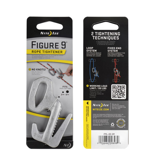 Nite Ize Figure 9 Rope Tightener - Large - The innovative, patented Figure 9 is a cord tightener that tightens, tensions, and secures cords without using knots. Constructed from strong aluminum, the Figure 9 allows you to tighten cord in both looped and straight line configurations. This ingenious little innovation was even recognized with an Editor's Choice Award from Backpacker Magazine. The Nite Ize Figure 9 makes tightening any line a stress-free task. From tying awkward objects to the back of a truck or vehicle to organizing tools or items in the garage, this handy tool secures large loads quickly and keeps tension where you need it. Loop your rope through its strategically designed prongs, pull it tight, and it stays that way. A smart alternative to complicated cam tensioning devices and bungee cords, our Figure 9 also controls the release of high tension, avoiding sudden and dangerous unloading. Two attachment methods for ultimate versatility Loop System Fixed End System Laser engraved instructions ensure ease in operation Use with your own rope or purchase a combination set that comes with rope Lightweight, strong aluminum construction Fits rope sizes fits rope sizes 1/8" (3mm) to 3/8" (9mm) Load Limit: 150 lbs. (67.5kg) Dimensions: 3.37" x 2.70" x 0.31" | 85.64mm x 55.13mm x 7.94mm Weight: 1.02oz | 29.00g