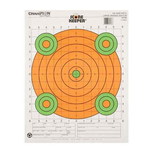 Champion Scorekeeper Fluorescent Orange Bull Target-A "built-in" record-keeping section lets you track vital data to refine your loads and zero-in on tight groups. Available for rifles, pistols, and airguns. 12 Pack of TargetsFlourescent Orange BullCenter Bull And 4 Outer Bull100 Yard Rifle Sight In