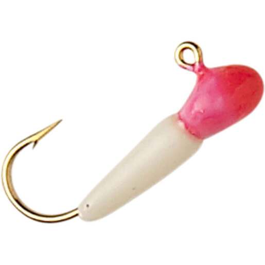 Custom Jigs & Spins Ratfinkee Ice Fishing Jig - The horizontal presentation of the Ratfinkee makes it a universal lure for all species of fish. A fine balanced lead head with a plastic body molded over a gold hook makes the Ratfinkee one of the most effective jigs ever created. With its horizontal orientation, finely-balanced lead head. Custom Jigs & Spins classic Ratfinkee is one of the most effective jigs ever created. Versatile lure for all fish species Fine balanced lead head One of the most effective jigs available Glow Brite technology 2 per pack Ice Fishing Fished shallow or deep, the Ratfinkee is hard to beat! The size 12 is probably the most effective lure for big bluegills in shallow water. The size 10 Ratfinkee is by far the most popular of all the Ratfinkee sizes and can be fished as deep as 20 feet with 2 lb. test line. The Ratfinkee works well with either a waxworm or spikes and shows up nicely on a locator because of its heavy, dense head. The size 8 Ratfinkee is a good choice for crappies since the hook will accept a small minnow. The size 6 Ratfinkee is perfect for larger fish or active perch and panfish. It will easily fish to 30 feet, which is a top choice for walleyes and bigger predators. It also works well on a deadstick, under a tip-up or rattle reel since it can be used to present the bait in a horizontal profile. Open Water Ratfinkees are very effective lures for open water fishing, whether for shallow water bluegills, stream trout or walleyes. Since fish are more aggressive in open water, a size 8 Ratfinkee should be used on fish that would go for a size 12 through the ice. Crappies respond well to size 6 Ratfinkees dressed with minnows, suspended below slip floats. In fact, they will perfectly balance many floats because of their 1/32-ounce weight.