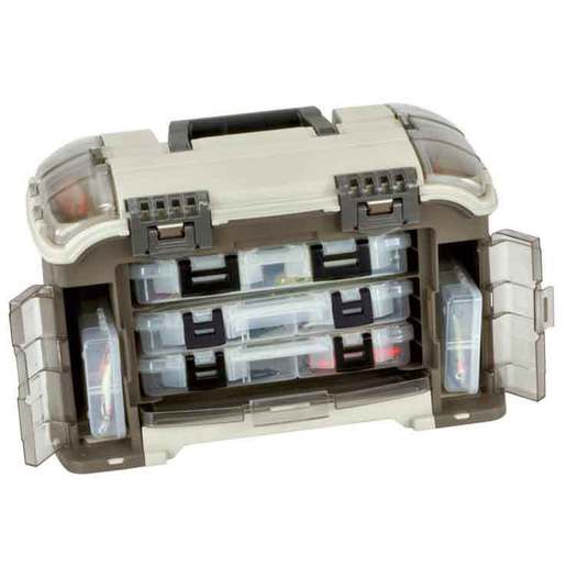 Plano 767 Guide Series Angled Tackle System - The Plano Guide Series 767 Angled Tackle System incorporates the 3600 size angled storage platform into hard system tackle boxes. The system features quick access, increased tackle security and multiple utility boxes and was engineered with the serious angler in mind. The system's main compartment presents utility boxes at a 15° angle for easy access. DuraView covers and doors keep contents visible at all times. The 728 Angled Tackle System includes two Plano 2-3650 utility boxes, two 3455 StowAway utility boxes, one 3607-04 FTO Elite utility box, and one 4648 polycarbonate wallet. Main compartment presents utility boxes at a 15° angle for easy accessIntegrated, expandable rear pocketDuraView covers and doorsIncludes five Plano StowAway boxes plus one polycarbonate walletDimensions 18"L x 9.5"W x 11"H