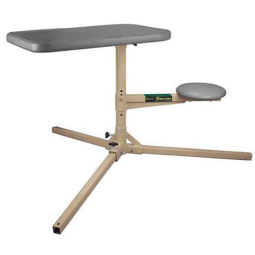 Caldwell Stable Table Shooting Bench - The entire frame of this shooting bench is made with welded steel. It has a comfortable padded seat that adjusts from 16-22 inches and rotates with the table top. Each of the three table legs can be adjusted to align perfectly with the horizon. The large 34x23in tabletop gives the shooter enough space to have ammo, cleaning supplies, and a gun vise on it at the same time. Cleaning forks are included with the Stable Table. Simply snap them into place and start cleaning. 360 degree rotation Durable welded steel frame Weatherproof synthetic top with rigid steel under-frame Cleaning forks lock into top and hold guns securely Adjustable height padded seat Comes with 3 BR feet Weight limit 275lbs Weighs 60 lbs Table top 34in x 23in Seat Height 16in to 22 in