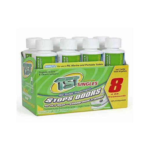 Camco TST Single Use RV Sewage Treatment Bottles 8 Pack - Single-dose treatments require no mixing or measuring. Each 4-ounce bottle treats 40 gallons. Eight bottles per box. Single use4 - oz bottleEight bottles per box
