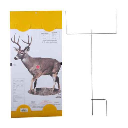 EZ Target CHOO EZ Deer Target -The deer target uses a special formula to replicate a deer that is 42" at shoulder height. Placing the target at 25 yards represents a life sized deer at 100 yards; placing the target at 50 yards represents a life sized deer at 200 yards. The target features a red dot for an aiming reference, and a data entry area on the bottom for recording your range session. These targets are great for teaching inexperienced shooters proper shot placement, and how to make clean and ethical shots on game. Once you run out of targets, just pick up a replacement pad and you're ready to go again. Made in USA! Target Dimensions: 14" x 22"Stand Dimensions: 14" x 29"Includes: 15 targets, backer, binder clips, and steel target standStand also works with EZ Target Coyote and Silhouette Replacement padsPortable, lightweight, and easy to use!
