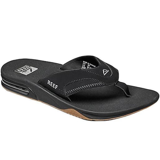 Reef Men's Fanning Flip Flops - This is the sandal of legendary three-time world champ and perennial pro surfing powerhouse, Mick Fanning the ultimate athletic sandal of comfortable water-friendly synthetic nubuck upper. Mick relies on the contoured injection molded EVA footbed with anatomical arch support and full 360-degree heel airbag enclosed in soft poly for good reason. And in the fun department, it also features a church key built into the footbed to open your 'soda' after a surf or hanging at the pool. Reef Icon Herringbone rubber outsole. The sandals of a champion. Church key to open your 'soda' bottle Reef Icon Herringbone Rubber Outsole Full 360 degree heel airbag Water Friendly EVA FOOTBED SYNTHETIC NUBUCK UPPER Hand wash cold with mild soap. Air dry away from heat Style: 002026