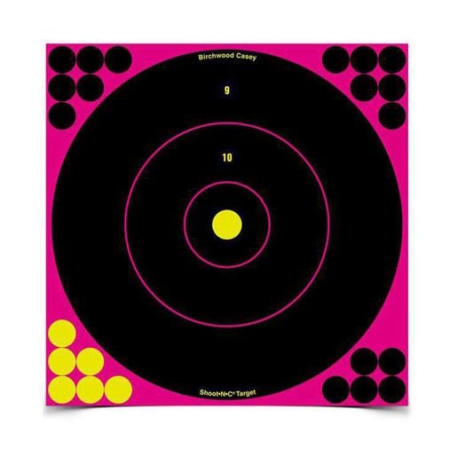 Birchwood Casey Shoot-N-C Pink Bull's -Eye Target -Each target comes with corner pasters for extended target life and for use as secondary targets.Bullet holes are revealed with bright pink rings.Great for indoor or outdoor use and low-light conditions. Bullet holes are revealed with bright pink ringsSelf-adhesive backing makes targets easy to put upEach target comes with corner pasters for extended target life. Great for indoor or outdoor use and low-light conditions.5 Targets-120 Pasters