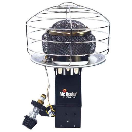 Mr Heater 540 Degree Tank Top Heater - The Mr. Heater 540 degree Heater 30,000 – 45,000 BTU Liquid Propane Tank Top heater with soft nose POL is the perfect solution for a variety of outdoor heating applications. This heater is constructed with an adjustable 360 degree burner head that swivels up to 180 degree which allows you to focus radiant heat in multiple directions. The MH540T is easy to light due to the push button TE valve, and its high quality stainless steel components bring you longer lasting durability and the standard tip over safety shut-off switch brings you peace of mind. Use while Camping, Fishing, Construction Sites, Loading Docks and Sporting Events. 360 degree Burner Head 180 degree Multi-Directional Bracket 30,000 BTU - 45,000 BTU per hour For use with Liquid Propane Push Button TE Valve Safety Shut-off Tip Over Switch Mounts to a 20 lb. cylinder Length: 11.6in Width: 22.6in Height: 16.8in Outdoor only Fuel Type: Propane Heat Type: Radiant