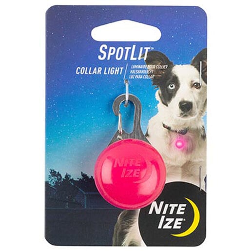 Nite Ize SpotLit Collar Light - The SpotLit Collar Light makes everything from nighttime walks to camping simpler and safer. Designed for all your adventures, the SpotLit is highly weather-resistant and easily clips onto the D-ring of your pet's collar or harness. This durable collar light makes it easy to keep track of multiple pets in the dark. A simple push of a button lets you switch from a constant glow mode to an attention-grabbing flashing mode. Weather resistant Secure stainless steel spring clip easily clips anywhere you need a little light! Push button switch Glow and flash modes Battery run time: Glow mode: 20 hours | Flash mode: 25 hours Easily replaceable 2 x 2016 3V lithium battery included