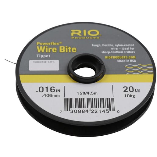 RIO Powerflex Wire Bite Tippet – RIO's Powerflex Wire Bite Tippet is a tough, flexible nylon-coated wire that's perfect for those sharp toothed critters. This knot-table, braided wire is supple enough to tie directly to the fly. Each spool has 15 feet on it. MPN: 6-2214