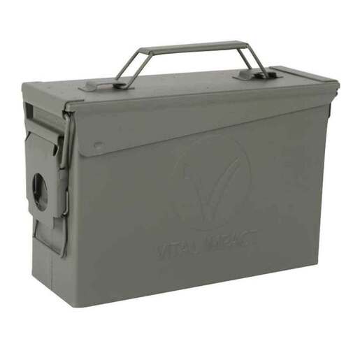 Vital Impact .30 Caliber Metal Ammo Can - Green -A water resistant gasket seals the lid and the collapsible latch keeps the contents safe inside, the stackable designed allows for multiple ammo / storage cans to be stack on top of each other. This ammo / storage can is ideal for storing your extra rounds, optics and electronics. Durable Steel Construction Rust Resistant Powder Coat Finish Water Resistant Gasket Sealed Lid Tight Latch Keeps Contents Safe Inside