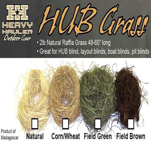 Heavy Hauler HUB Field Grass - 48 inches to 60 plus inches long fibers. Long enough to cover the front or back of a boat, pit, layout, or HUB blind. Loop it through stubble straps or simply tie it on. 48-60 Plus -InchesFrom Madagascar