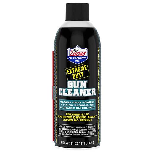 Lucas Oil Extreme Duty Gun Cleaner - Used and recommended by major firearms manufacturers, Lucas Oil Extreme Duty Gun Cleaner's consistent high pressure spray contains a unique blend of solvents and cleaning agents designed to blast away powder residue, grease, oil and other debris from firearm actions, slides, barrels and parts. Safe on your firearm's metal finishes and will not harm polymers subjected to incidental contact. This unique formula displaces water, great for when your firearm is caught out in a rainstorm while hunting. Its quick drying, zero residue properties make it ideal for final degreasing of firearms prior to bluing, parkerizing or spray finish applications. The non-chlorinated, CFC free formula dries quickly and leaves no residue. Read entire label before using this product. Features Superior cleaning and drying formula. Non-chlorinated and CFC free.