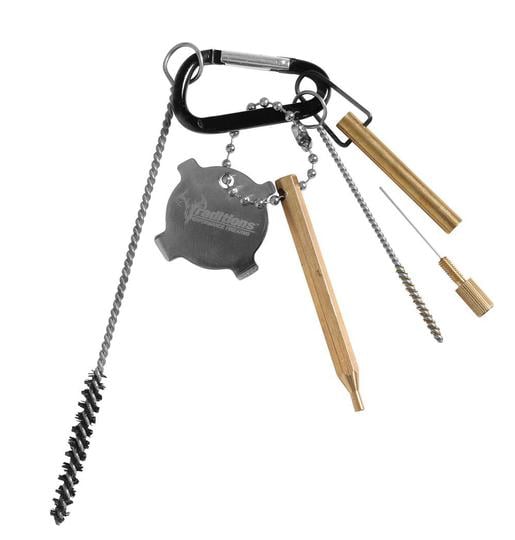 Perfect for 209 or Percussion Shooters at the range and in the field! Kit includes carabiner, universal cleaning pick, brass rod punch, fire channel brush, nylon round cleaning brush and four-sided steel screwdriver.