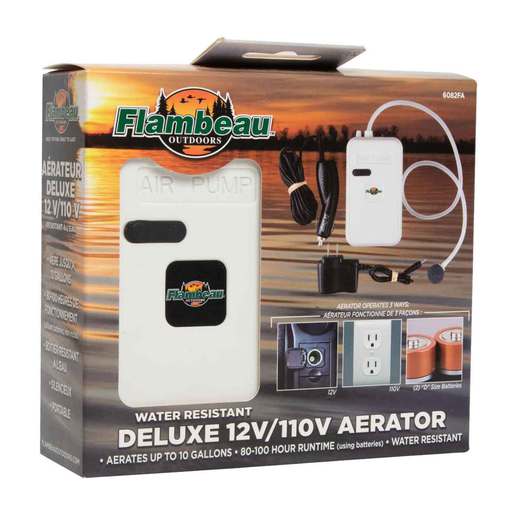 Flambeau Deluxe 12V/110V Aerator Bait Storage Accessory - Flambeau Deluxe 12V/110V Aerator Bait Storage Accessory lets you use a 12V or 110V adapter to keep live bait healthy during transportation. Runtime: 40 Hours Product Size: 5.4in L x 2.25in W x 6.1in D Runs on (2) D batteries, not included Includes air hose, stone, 12V and 110V adapters