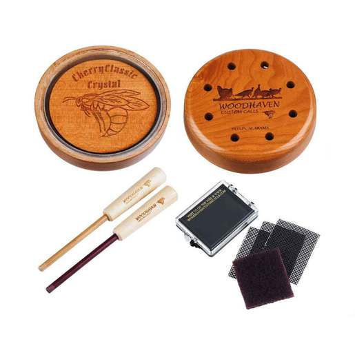 Woodhaven Calls The Cherry Classic Crystal Turkey Friction Call - The most versatile of the series, the CherryClassic Crystal is easy to use. With a range of sound from the highest and sweetest notes on the front to a raspy, absolute drop off across the shelf. The hard biting two note yelps and cutts are remarkable on this call. Surface Conditioning Kit Surface Saver Lid 2 hand matched strikers