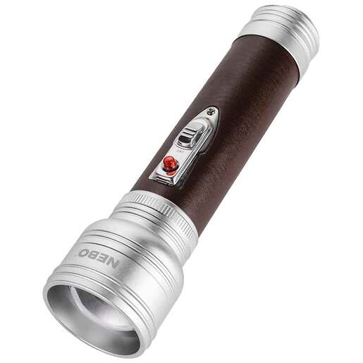 NEBO Classic Full-Size Flashlight - Introducing the Classic, a perfect blend of modern technology and timeless design. This 1920’s inspired flashlight outputs 640 lumens and features a sturdy, anodized aluminum housing with constructed leather grip and a lanyard ring. Comes in a beautiful hard gift box -- perfectly presenting the Classic as a cherished gift. Convex lens OC Technology Anodized aircraft-grade aluminum IPX4 water-resistant Impact-resistant (tested for up to 1-meter drops) Constructed leather grip Collapsible lanyard ring