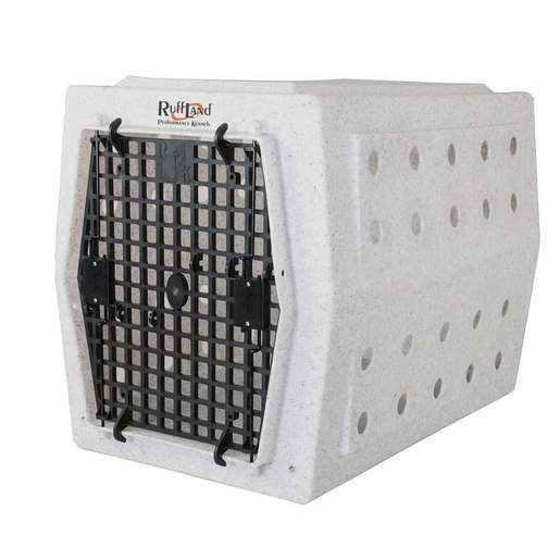 Ruff Land Single Door Dog Kennel - Designed with straighter sides this kennel can fit through narrow doorways such as campers. Vent hole pattern displayed comes standard (1 3/8in) with two finger holes in the back. All kennel sizes except small are outfitted with composite doors. Ruff FLEX Technology StackRight Design SureVent Tapered Wall Design UpSide Raised Floor Interior 2-Way Door No Bite Grid Pattern Design Rattle-Free