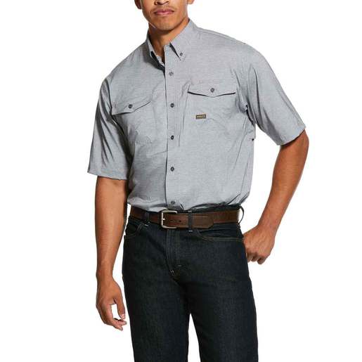 Ariat Men's Rebar VentTek Short-Sleeve Shirt - Rebar™ Made Tough Shirts are made to work hard and keep you comfortable all day long. Greater Arm Mobility seam construction for maximum range of motion Moisture Movement Technology™ keeps you drier VentTEK™ technology features body mapping to enable air flow and regulate body temperature Elastic fibers woven into fabric for maximum flex Hidden microfiber lens cloth on shirt tail Triple needle stitched for added durability 4 oz technical stretch fabric Button-down chest pockets and collar Mesh lining Vent panels Metal buttons Drop tail hem Embroidered logos 92% Polyester/8% Spandex Style: 10031027