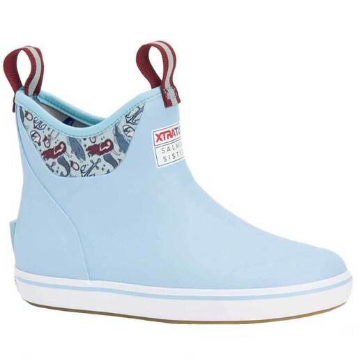Xtratuf Women's Salmon Sisters Ankle Deck Rubber Fishing Boots - This ankle deck boot has original prints designed by the Salmon Sisters and has all the Xtratuf features you know and love. Recommend half sizes order up 100% Waterproof Slip-Resistant Chevron Outsole XPRESSCOOL™ Liner Pull-On Tabs Style: XWAB-101, XWAB-2BM