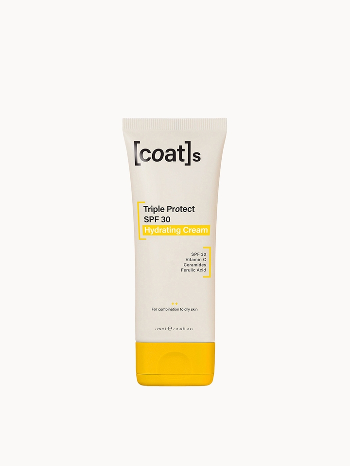 Providing non-comedogenic protection, the [coat]s Triple Protect SPF 30 Hydrating Cream shields the skin from damaging UVA and UVB rays, while working to visibly brighten and smooth. Powered by ferulic acid and vitamin C, the moisturising cream lends antioxidant defence against urban aggressors that can dull the skin. This illuminating duo works to unify and balance the look of the skin tone, leaving a radiant, even result. Supporting the formula is a blend of fatty acid-rich ceramides that help to noticeably plump, soften and hydrate, delivering an ultra-supple skin texture.
