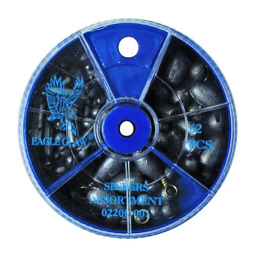 Eagle Claw Multi Style Sinker Assortment Terminal Tackle Accessory - Split-Shot, Egg, Pinch-On, Worm-Weight, and Bass Casting sinkers in various sizes. 62 pieces.