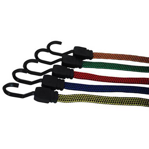 Attwood Flat Bungee Set Marine Accessory - 5-piece set includes 12", 15", 25", 35" and 45" premium flat bungees with plastic encapsulated hooks. Individual colors. 5/8 in. (15.88 mm) width makes the cords three times stronger Encapsulated injection molded plastic to prevent corrosion and protect surfaces Wide hook gap allows for many tie-down options Package includes six (6) bungees at five (5) lengths