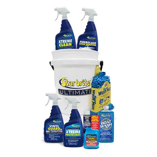Star Brite Ultimate Boat Care Kit - Boat Wash 16 fl. oz. Ultimate Xtreme Clean 32 fl. oz. Star Tron Gasoline Additive 8 fl. oz. Ultimate Vinyl Guard Spray 32 fl. oz. Ultimate Xtreme Protectant 32 fl. oz. Ultimate Fiberglass Stain Remover Spray (Gel) 32 fl. oz. Wash Mitt Micro Fiber Reggae (Blue). Ultimate 5 Gal Bucket.