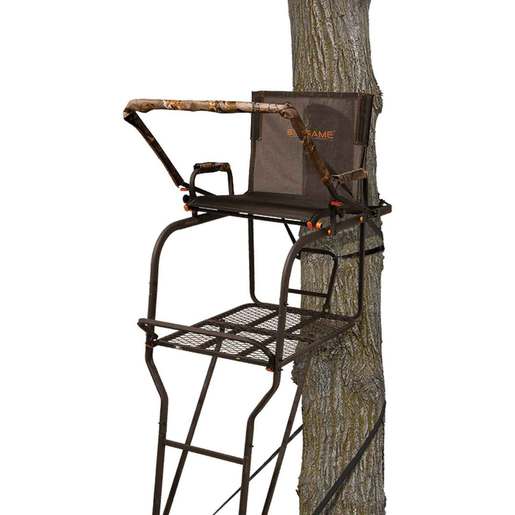 Big Game Hunter HD 1.5 Treestand Adjustable, Removable, Padded Shooting Rail that Flips Up Extra Wide Seat that Flips Back Extra Wide and Deep Foot Platform for Wide Stance Flip-Back Footrest Flex-Tek Seat Contours to Legs and Back for Ultimate Comfort CONSTRUCTION: Steel HEIGHT: 18′ 6″ to Shooting Rail FOOT PLATFORM: 23.5″ Wide x 29″ Deep SEAT SIZE: 23″ Wide x 18″ Deep SEAT STYLE: Flex-Tek Seat, Flips Up SEAT HEIGHT: 20.5″ BACKREST: 23″ Wide x 18″ Tall SHOOTING RAIL: Padded, Flips Back, Adjustable FASTENERS: Two 1″ Ratchet Straps, Two 1″ Stabilizer Straps SUPPORT BAR: Adjustable LADDER SECTIONS: 4 x Single Rail, oval tubing SAFETY HARNESS: One Full-Body Fall Arrest System WEIGHT: 61 Lbs WEIGHT RATING: 350 Lbs TREE SIZE: Minimum 9′ Diameter