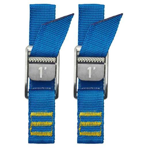 NRS 1 inch HD Tie-Down Strap Set - Born on the river, ready for whatever. First sold in 1978 as a better way to tie down gear and frames on whitewater rafts, the NRS 1inch Heavy Duty Strap is known the world over for its incredible strength and versatility. The ultimate DIY tie-down solution, every boater, outdoorsperson and homeowner should own an assortment of sizes. Features Unlike clunky ratchet straps and cheap imitations the NRS Strap is strong, easy, fast and simple with unlimited usefulness. UV-protected polypropylene webbing won't stretch when wet and delivers an impressive Minimum Breaking Strength (MBS) of 1,500 lbs. Custom cam buckle features dual stainless-steel springs for a strong, even bite that won't slip, ever. The strap size is prominently indicated on the buckle so there's never any guesswork. Iconic Blue straps keep with the traditional design with the strap size woven into the webbing. A woven name tag near the buckle lets you reclaim your straps from friends who borrow but don't return. Hidden bottle opener on the buckle aids one of the most popular "strap hacks." All sizes are sold in pairs.