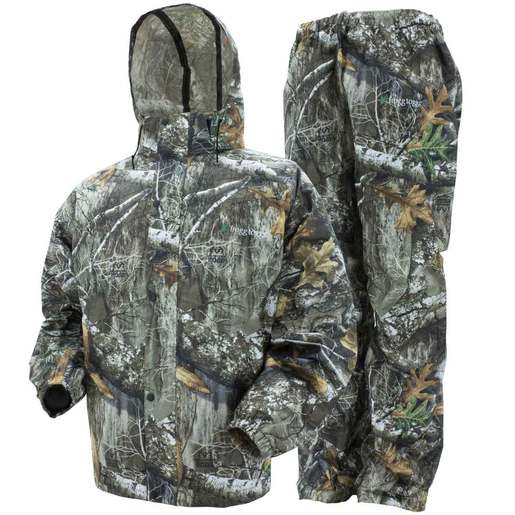 Frogg Toggs Men's All Sport Waterproof Packable Rain Suit - This full coverage rain suit is made to keep you dry even in the stormiest conditions. It's waterproof and breathable, so you can stay out longer and the all-over camo pattern helps keep you concealed. Fully taped and sealed seams in the pants and jacket Adjustable removable hood Full length parka cut Raglan sleeves for greater range of motion Open waist design with E-Z push cord locks Front zip with snap down storm flap Elastic cuffs on wrists Pants have an adjustable elastic waistband Adjustable leg openings 4 panel cut and straight leg design Style: AS1310