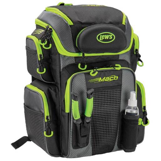 Lew's MACH HatchPack - The MACH Hatchpack is built for those few who fish off the beaten path. Designed to keep your trusted gear secure and safe from the elements, this pack features a rugged and tough polyester build. A rubberized, textured base keeps this pack stable on the boat deck or a creekside boulder. Featuring 600 D polyester with honeycomb ripstop polyester panels and EVA wall construction that can brave the weather and the elements right along with you. 7 compartments and 5 rubber mesh pouches provide ample storage opportunities tools and baits, with the large main compartment holding up to 5-3700 style tackle boxes The front side of the bag touts a pliers holder, as well as a juice pouch for Speed Cleanz line spray, sunscreen, etc. To boot, a sturdy sunglasses case is directly on the front side of the pack for easy access at all times. A line spooling grommet is included on one side compartment to make spooling up simple and easy when on the run Includes 1–13.75in x 8.75in x 2in utility box Can hold up to 5 -3700 style boxes in main compartment. Bag Dimensions are 20in H x 16in W x 9.25in D