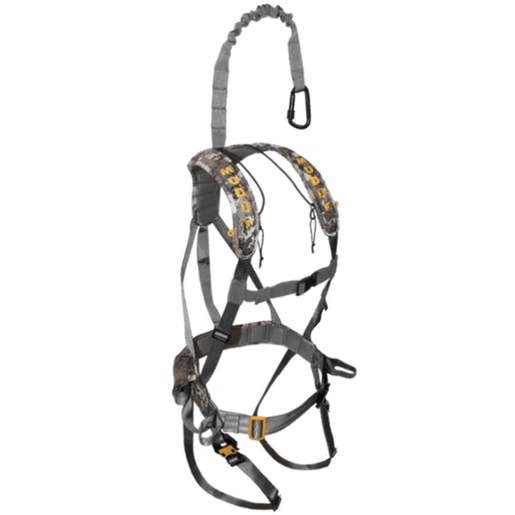 Muddy Ambush Safety Harness - The Ambush Safety Harness features the iconic Optifade Elevated II camo pattern. One-Hand Quick-Set Carabiner Clip Flexible Tether For 360° Movement New Innovative Binocular Cables, Lightweight And Extremely Durable Padded Waist Strap For Extreme Comfort Suspension Relief Strap Pocket For Easy Access Quick-Release Leg Buckles With Adjustable Leg Straps New Durable Elastic Chest Strap To Keep Harness To Chest Light Weight Padded Nylon Construction Optifide Elevated II Camo Standard Quick Release Buckles Weight: 1.9lbs Weight Rating: 300lbs