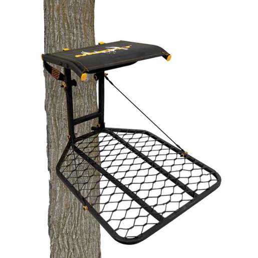 Muddy The Boss Treestand - The Flex-Tek seat flips back for full platform use and has silent straps with no metal on metal contact. Flex-Tek Seat Seat Flips Back For Full Platform Use Silent Straps, No Metal On Metal Contact Wide Stance Platform Construction: Steel Foot Platform: 24in Wide x 30in Deep Stand Weight: 17lbs Weight Rating: 300lbs