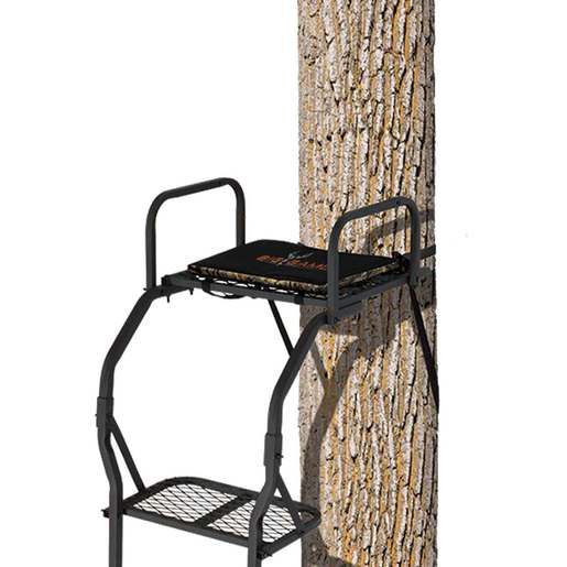 Big Game The Warrior Pro Treestand - A steel framed ladderstand tree stand with a 300lbs weight rating. Construction: Steel Foot Platform: 19in Wide x 10in Deep Seat: 20in Wide x 13in Deep, one piece, removable Ladder Sections: 3 Single Rail Sections Support Bar: Adjustable Safety Harness: One 4-pt. Full-body Harness Minimum Tree Size: 9in Diameter Weight Rating: 300 lbs