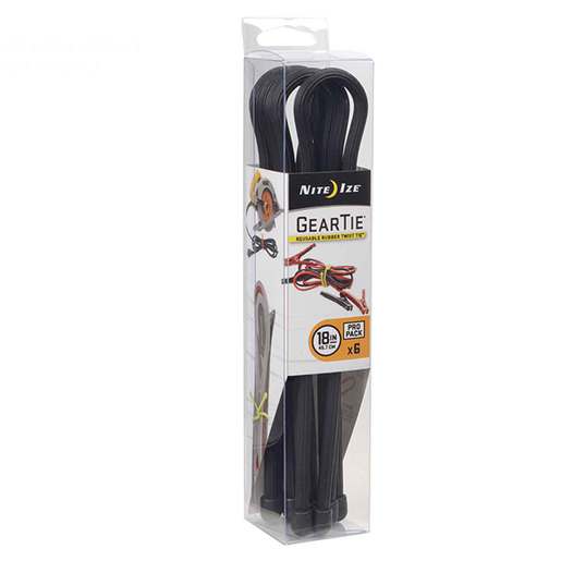 Nite Ize 18 inch Gear Tie ProPack Reusable Rubber Twist Tie - 6 Pack - The patented Gear Tie Original is the most versatile way to wrap, hang, and organize nearly anything. Featuring a strong bendable wire interior that holds its shape and durable rubber exterior, the Gear Tie Originals can be twisted, tied, and reused over and over indoors and outdoors. Discover why so many people find Gear Ties indispensable. The 18" Nite Ize Gear Tie is the perfect size to wrap and organize medium-to-large appliance cords and wires. Keep your jumper cables, extension cords, dog leashes, and larger electric cords neat and untangled with a quick simple twist. The 18" Gear Tie is also great for looping and hanging lightweight tools and lanterns - and reusable nature makes it easy to reposition and adjust conveniently. Use Gear Ties in the garage, on the boat, in the home, and in countless other places where things need to be secured and organized Waterproof and safe for use in fresh or salt water without damage UV resistant - will not be damaged or destroyed by extended sun exposure Tough rubber shell provides excellent grip Use indoors and outdoors in any weather. Strong wire inside holds its shape Won't scratch or mark Twist it, tie it, reuse it Thousands of uses Gear Tie ProPacks make tackling multiple wrapping, hanging, or looping jobs a breeze