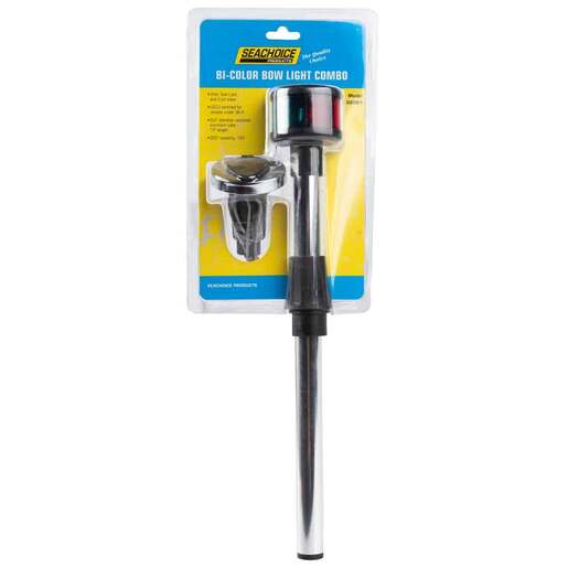 SeaChoice Bi-Color Bow Light Combo with Task Light Boat Accessory - The Seachoice Bi-Color Bow Light Combo with Task Light is a 12V 3/4in diameter anodized aluminum tube that has 225° visibility and includes a 3-pin base. The bow light combo pole will fit Attwood #910257 & Perko #1045300DP bases. The length of the pole is 12-4/5ft long with out the base. The base is made of a chrome plated cover with a plastic insert. This light is USCG certified for vessels under 39-1/3ft.