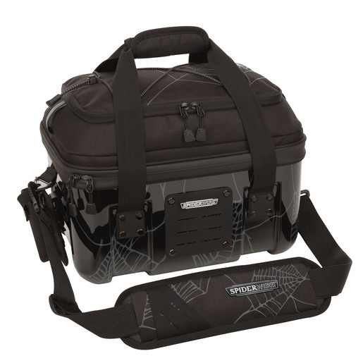Spiderwire Stealth Soft Tackle Bag - The Spiderwire Stealth Tackle Bag has an insulated hard-shell main compartment which fits up to four medium utility boxes. Features: Dimensions: 13-1/2in x 9-1/2in x 10in Laser-cut hypalon for accessory attachment Adjustable padded shoulder strap with additional hypalon attachment point Bungee cord webbing with safety accents Water-resistant zipper on main compartment Detachable tool holster Soft-sided top compartment fits one medium utility box Four medium utility boxes included