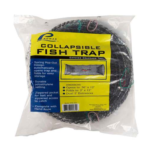 Promar Nets Collapsible Live Bait Trap - The Promar Nets Collapsible Live Bait Traps are great for catching smelt, shrimp, minnows, crawfish, and just about any kind of bait. Built with a Spring Pop-Out Design, these traps open automatically in one step and fold for easy storage. Each trap features a zippered pocket for bait and a zippered access to catch. Complete with hand rope. Durable polyethylene netting.