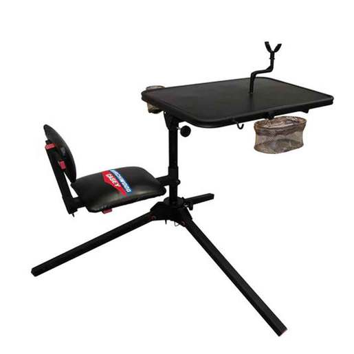 Birchwood Casey Xtreme Shooting Bench - The Xtreme Shooting Bench from Birchwood Casey offers superior comfort with a 2in thick padded back rest and seat with the option for the seat and top to swivel together or independently. This top can swivel at 360 degrees for undeniable versatility. The 23in W x 34in L padded top offers a comfortable and stable shooting surface for target practice or field hunting. It includes three interchangeable accessories: a cup holder, EZ access gear basket, and gear hook. The adjustable seat is 12in W x 41 D x 2in thick with a weight limit of 300lbs, while the bench itself weighs 46lbs. 360 Degree Seat Rotation 2in Thick Padded Back Rest Weight Rating: 300lbs Superior Comfort