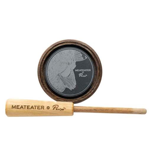 MeatEater by Phelps Crystal/Slate With Striker Walnut Pot Call - Crystal/Slate Pot Call: Once this handcrafted pot call has been prepped and tuned, it will coax in the most call-shy turkeys in damn near any conditions. The walnut pot, crystal surface, slate soundboard, and hickory-tipped striker join to make realistic clucks, purrs, and high-pitched, two-tone yelps. Creates Realist Clucks, Purrs, And Yelps Handcrafted Pot