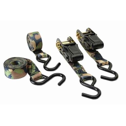 HME Camouflage Ratchet Tie Down Straps - 4 Pack - Use for tying down equipment or to update worn and weathered tree stand ratchet straps. 8ft Ratchet Tie Down Straps 1500lb Capacity Weather Resistant S Hook With Rubber Coated Grip 4 Pack