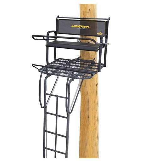 Rivers Edge Lockdown 2-Man Hang On Treestand - No longer will you have to trade security for height. Ratchet the platform tight to the tree before ever leaving the ground. This clever system allows the user to pull the straps up to the top of the stand while standing on the ground. Then ratchet the straps tight up top, firmly securing the stand to the tree from the ground. Nothing is safer or easier to use. The Lockdown 2-Man ladder stand features a flip-up, TearTuff mesh bench seat allowing for 1 or 2 hunters. The 42in wide platform provides plenty of extra room for standing shots. The Lockdown 2-Man features a 2-way adjustable shooting rail allowing you to set a height and depth that works for you. The Lockdown 2-Man features dual tree blades, oversized platform ratchet straps, and octagonal tubing for unmatched stability. Big And Comfortable Lock It Down From The Ground Ultimate Shooting Rail Extra Large Platform Silent Design Steel Construction