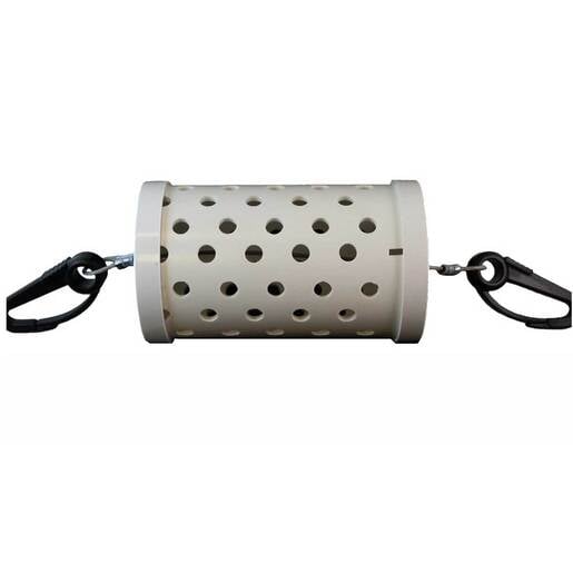 Promar Seal Proof Bait Crabbing Cage - The seal proof bait cage is made of rigid PVC tubing which protects your bait from seals and other predators. High grade stainless cables and clips secure this cage to hoop net rings and traps. Removable cap & quick release clips makes baiting a synch and easy to flush and clean.