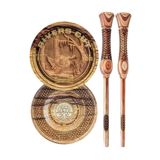 Primos Rivers Cut Turkey Pot Call - Conceived from an unending desire to outwit. Designed by master call makers. Proven on the wild turkey. Primos brings to you the Rivers Cut Pot Call. Crafted from the most exotic woods, detailed with intricate engraving, and finished with a premium glass surface, the Rivers Cut finds its home in the woods or on the mantle. Originally designed for Wilbur Rivers Primos, The Rivers Cut proudly bears his name, and creates a sound only carefully selected hardwoods can produce. Tailor-made specifically for the River’s Cut Pot, come two strikers, each chosen to create a distinct tone. Both strikers hold a cut knurled guide made for the perfect finger placement while calling. Due to the rarity of these exotic woods, the River’s Cut Pot Call will only be available for a limited time. Exotic Hardwood Hand Selected By Master Call Makers Intricate Art, Precision Craftsmanship, And Exceptional Sound Two One-Piece Wood Strikers With Cut Knurled Guide For Handling