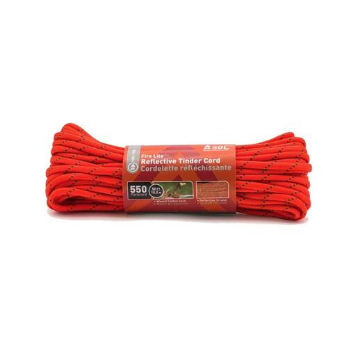 SOL Fire Lite Tinder Utility Cord - The Fire Lite Tinder Cord in the 550 Grade is a 7 strand paracord and easy-to-use fire starter in one with a waxed cotton inner core. Durable enough to take on any adventure, tie down your gear, or start a fire with ease. The polyester outer sheath provides a rugged protective layer for the ignitable waxed cotton inner core. Whether you pack it in your emergency kit or wrap it around your water bottle, the Fire Lite Tinder Cord is a multi-purpose life-saving tool.