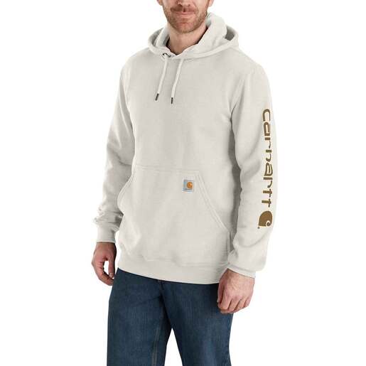Carhartt Men's Loose Fit Midweight Logo Sleeve Work Hoodie - Cut the morning chill with this sweatshirt. 50% Cotton/50% Polyester blend Carhartt-strong, triple-stitched main seams Midweight Three-piece hood with drawcord Rib-knit cuffs and waist help keep weather out Front handwarmer pocket Carhartt signature logo on left sleeve Carhartt patch sewn on pocket Style: K288