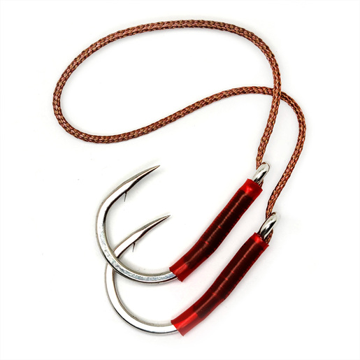 Gamakatsu Double Assist 520 Specialty Hook - Gamakatsu’s Double Assist hooks are designed for fast and easy replacement on all types of butterfly, flat fall and “iron” jigs. The 6in super strong braided line loop can be adjusted to position each hook at the exact desired length, even or offset. Red heat shrink tubing on the hook shank is an added attractor and prevents chafing and bite-offs. Hooks are forged and barbed. Available in 2/0 and 4/0 in packages of two.