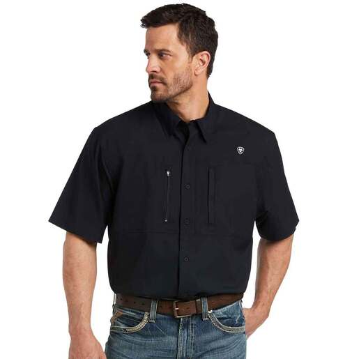 Ariat Men's VentTEK Classic Fit Short-Sleeve Work Shirt - Breathable TEK woven fabrication, built-in sun protection, and moisture-wicking makes this stylish button-front shirt a hot-weather winner. AriatTEK Heat Series technology keeps you cool and VentTEK uses body mapping to enable air flow and regulate body temperature Moisture-wicking Underarm gusset for mobility Hidden microfiber lens cloth on shirt tail Extended breathable mesh yoke Hidden collar buttons Zippered front chest pockets 100% polyester ripstop Style: 10034960